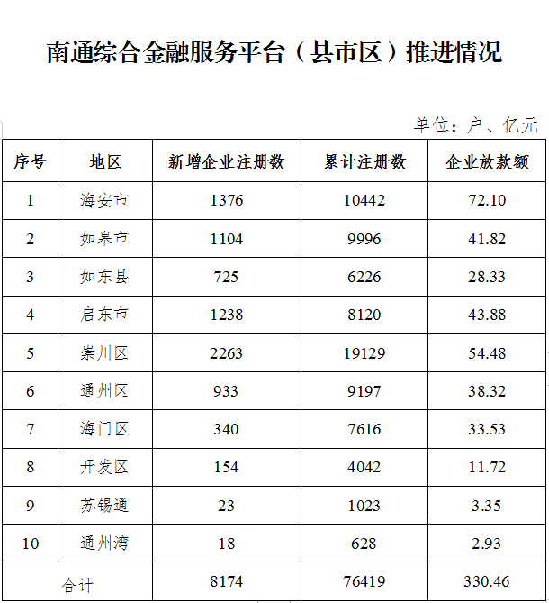 从县市区来看,崇川区、海安市、启东市新增企业注册数较多。崇川区、海安市和如皋市累计注册数居前。海安市、崇川区、启东市放款金额领先,均超过40亿元。