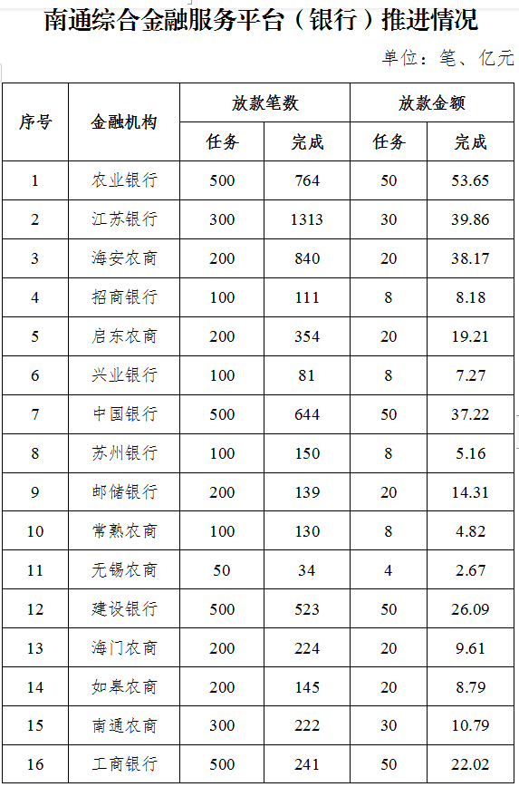 从金融机构来看,农业银行、江苏银行、海安农商行放款金额领先,均超过30亿元。江苏银行、海安农商行、农业银行放款笔数位列前3名。